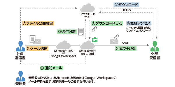 誤送信を添付ファイルダウンロードリンク化/添付ファイル暗号化/宛先Bcc変換処理で無効化します。