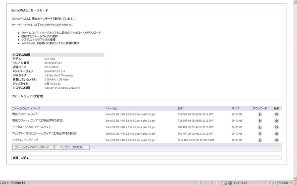 - 現在、SonicWall SRA/SMAに読み込まれているファームウェアで工場出荷時の設定に戻す。