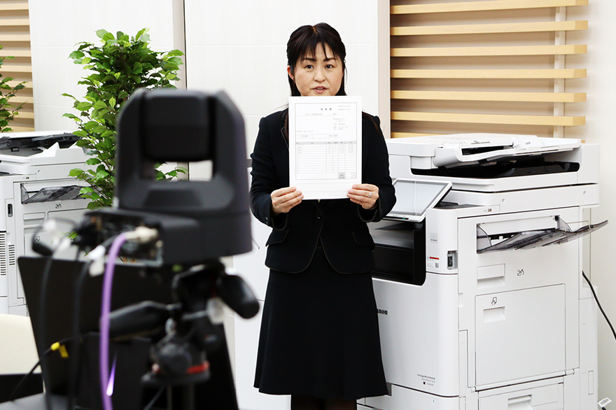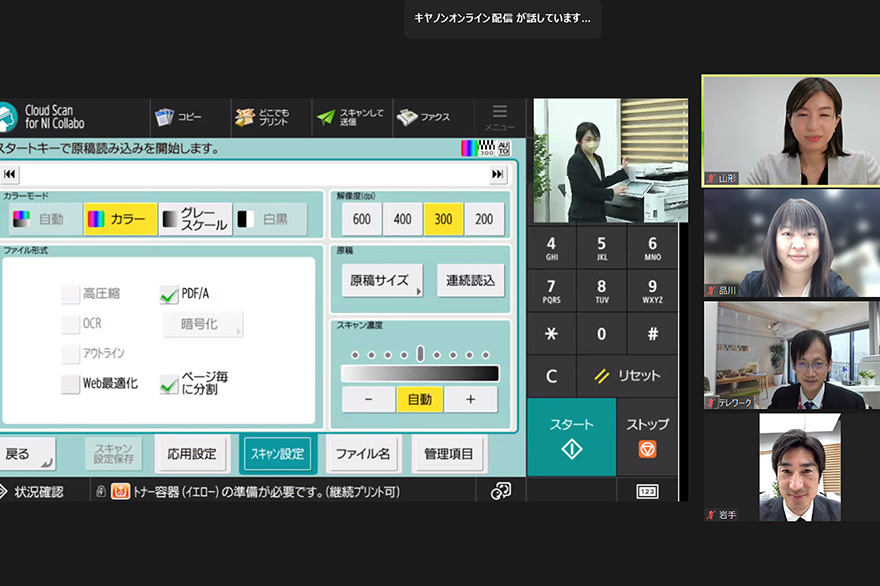 お客さまの業務課題解決を体験いただける仮想オフィス空間よりさまざまなデモンストレーションを実施しています。キヤノンの4K対応リモートカメラを活用したオンライン配信で全国のお客さまにデモンストレーションをご覧いただけます。