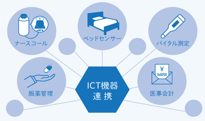 ナースコールやベッドセンサー、見守り機器など多種多様なICT機器と連携し、様々な記録をCAREKARTEで一元管理することもできます。