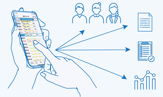 CAREKARTE Mobileは、直感的に操作できるモバイルシステムです。入力が簡単で速いため、モバイルに慣れていない職員でも簡単に使用できます。介護現場におけるさまざまな種類の記録を入力できるため、すべての職員が記録入力できるようになります。すべての記録が電子化されることによって、紙や転記の手間を省くことで、介護現場の効率化を実現できます。