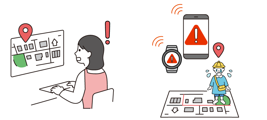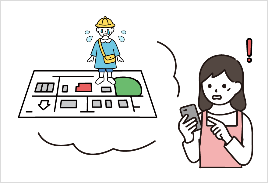 お散歩や園外活動の安全対策として、子どもが既定の距離以上に離れると、先生のスマートフォンにアラームで通知されます。目の届かない場所でもGPS機能を使って位置情報を確認し、子どもを探し出すことができるので、安心して見守ることができます。また、施設のパソコン画面からも、先生や子どもの位置を地図で確認でき、複数の先生で子どもを見守ることが可能です。