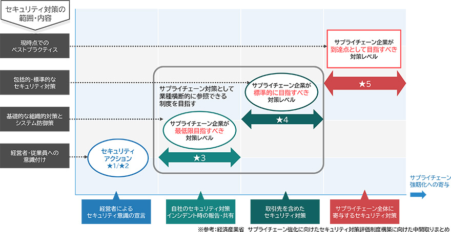 IPAが実施するセキュリティ対策段階を自己宣言する制度である「SECURITY ACTION」では★1と★2が定義されており、経済産業省による「サプライチェーン強化に向けたセキュリティ対策評価制度」では、それに続く形で、★3、★4、★5の3つの対策段階が定義されます。
