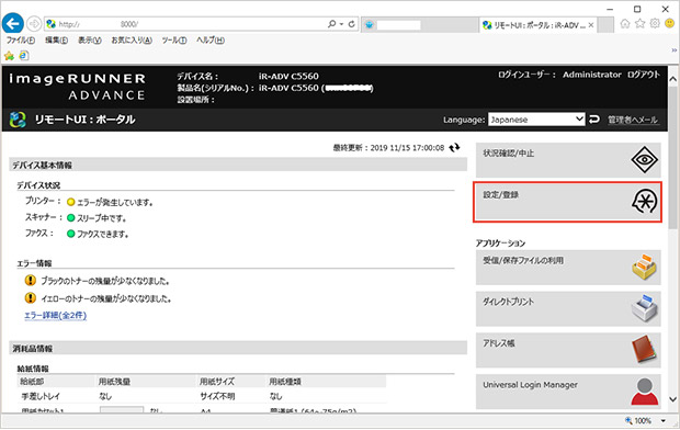 「リモートUI」で「設定/登録」ボタンをクリックします。