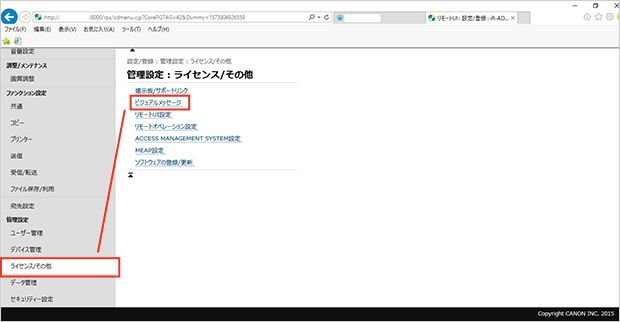 「ライセンス/その他」>「ビジュアルメッセージ」をクリックすると「表示設定」画面が開きます。