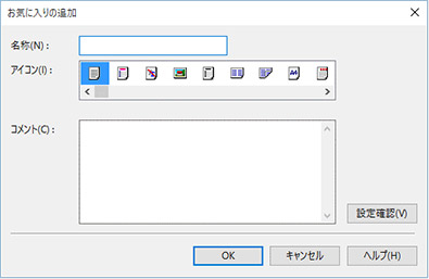 お気に入りに新たに設定を登録する際は、あらかじめプリンタードライバーの設定を変更した上で「追加」ボタンをクリックし、表示される「お気に入りの追加」ダイアログで任意の設定名称やアイコン、説明用のコメントを記入し「OK」を押します。