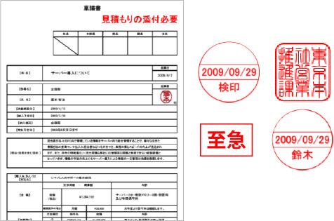 電子印鑑を使用すると、紙の文書に「捺印」して内容を承認するかわりに、PDF文書/バインダー文書に電子印鑑を貼り付けて内容を承認することができます。