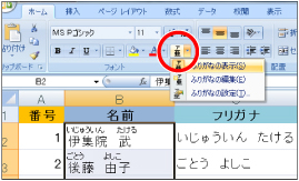 対象となるセルを選択し、「ふりがなの表示/非表示」ボタン横の「▼」を押して、展開したメニューから「ふりがなの設定」を選択します。