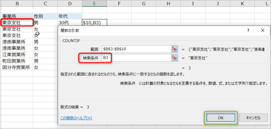 検索条件の欄にうつり、B3セルを選択し[OK]ボタンを押してウィンドウを閉じます。