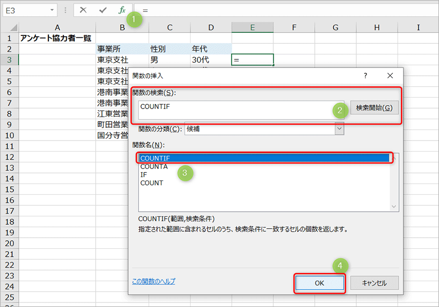 左上の[fx]ボタンをクリックし、関数の検索に「COUNTIF」と打ち込みCOUNTIF関数を選択して[OK]を押します。