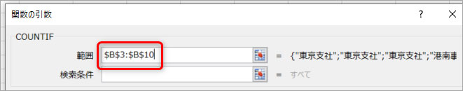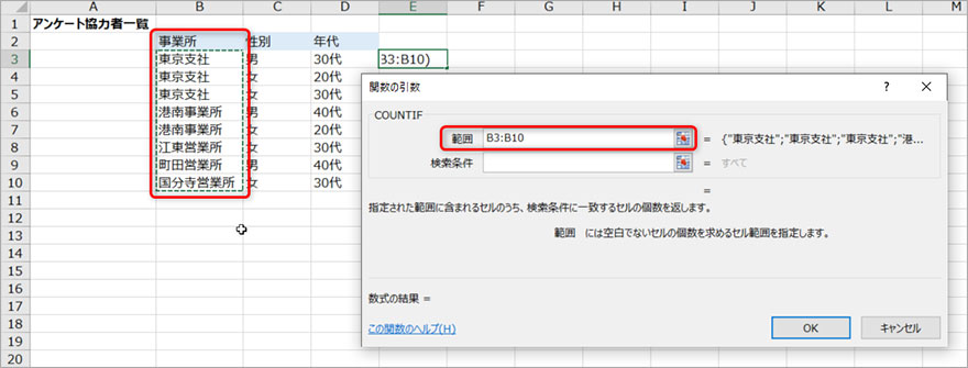 今回のケースでは事業所の重複データを確認したいので、B3セルからB10セルまでを選択します。