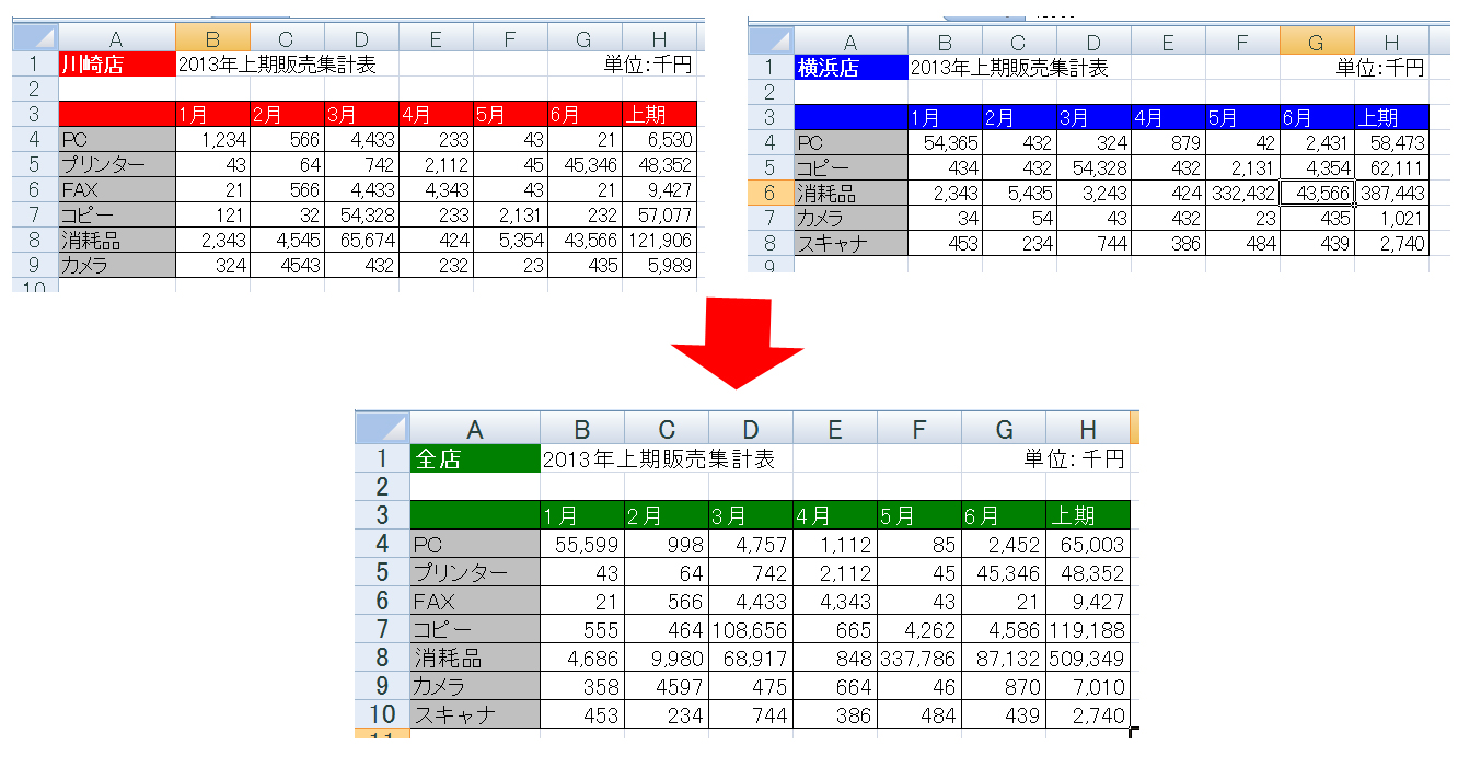 例えば、表の項目が全く同じ場合「3D集計(別名:串刺し集計)」という集計方法を使うことで簡単に数値が集計できます。そして、今回の問題のように各表の項目数が異なる場合には「統合」機能を用いることで簡単に集計することが可能になります。