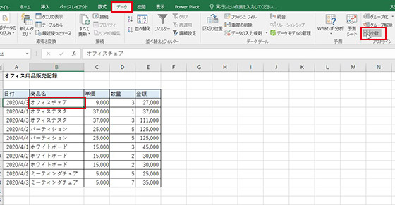 販売記録の表内のセルを選択した状態で「データ」タブの「小計」をクリックします。