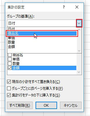 今回は商品別の売上を求めるので、グループの基準を「商品名」に変更します。