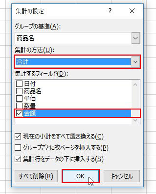 集計の方法が「合計」、集計するフィールドが「金額」になっていることを確認し、「OK」をクリックします。