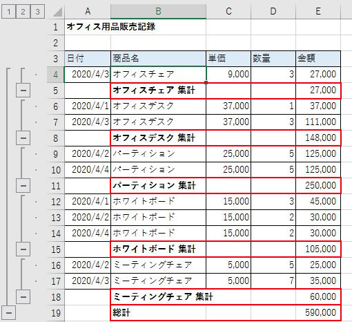 表の左側のマイナスボタンを押すと、詳細が非表示になり小計のみ表示されます。
