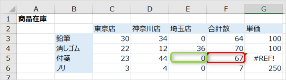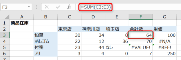 今回の場合、上下のセルがSUM関数を利用して計算しているのに対し、このセルのみ四則演算を利用して計算をしています。