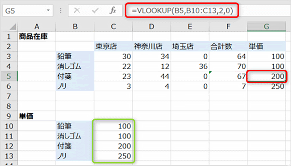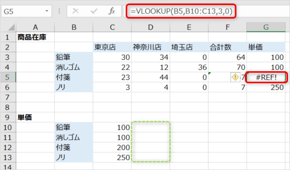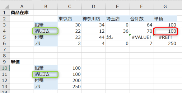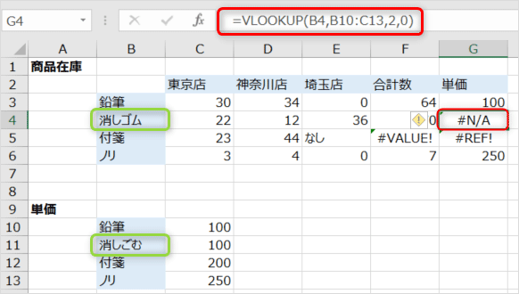 【VLOOKUP関数】で、単価の表を参照しようとしていますが、入力元の商品在庫の表と指定先の単価の表で「消しゴム」の表記方法が異なっています。