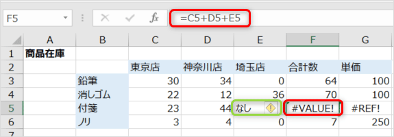C5・D5・E5のセルの合計値を求めようとしていますが、E5のセルには数値ではなく文字が入力されています。四則演算を行う際には、セルを数値で入力するのがExcelのルールです。