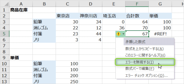 このような場合では、「上下の式と流れが違っている」ことでこの三角マークが表示されています。しかし、式の内容に間違えはないので「エラーを無視する」でマークを非表示にしてしまって問題ありません。