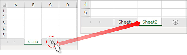シートの「新規作成」は、シートの隣にある円い「+(プラス)」マークの部分をクリックします。「Sheet1」の隣に新しく「Sheet2」という名前でシートが新規作成されました。