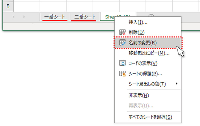 シートの名前を変更するには、(1)シートタブの上を右クリック、(2)メニューから「名前の変更」をクリックすると好きな名前を入力できる状態になります。シートの名前の部分をダブルクリックしても、同じように書き換えることができます。この例ではSheet1、Sheet2をそれぞれ「一番シート」「二番シート」と書き換えています。
