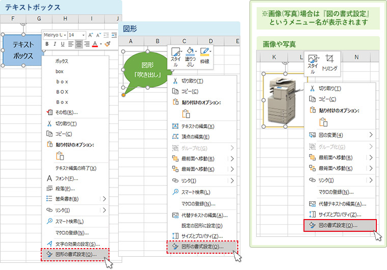 テキストボックス・図形、画像(写真)を右クリックし、表示されるメニューから「図形の書式設定」を選択します。
