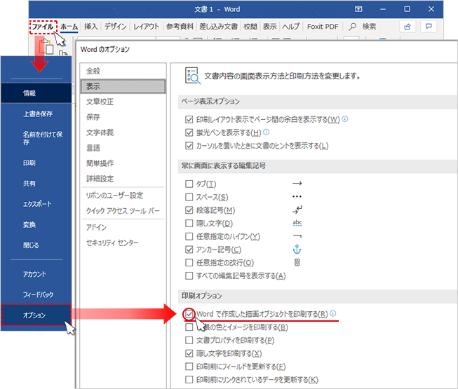 ■ Wordの場合は、メニュー「ファイル」→「オプション」をクリック、表示された「Wordのオプション」ダイアログから「表示」→「印刷オプション」の中の「Wordで作成した描画オブジェクトを印刷する」のチェックを外すことで、図形や画像を印刷非表示にすることができます。