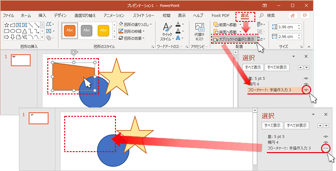■ PowerPointの場合は、いずれかの画像/図形をクリックし、「書式」メニューの「配置」→「オブジェクトの選択と表示」をクリックします。