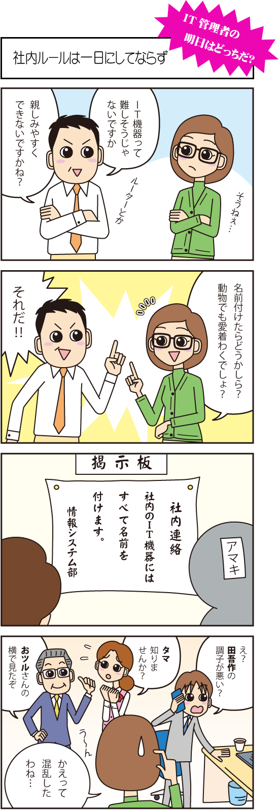 まずは社内ルールを明確にし、的確に運用していきましょう。社内ルールの策定はセキュリティ面だけではなく、障害が起きた場合の対処や機器の入れ替えなど、IT管理者の業務の効率化にもつながります。