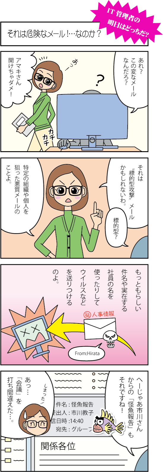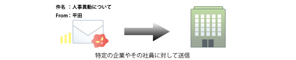 標的型攻撃メールとは、特定の組織や個人に対して、関係者や知人を装って悪質なメールを送信する攻撃です。もっともらしいタイトルや実在の社員を騙るメールで、添付ファイルやURLなどを開くと不正プログラムが実行されます。