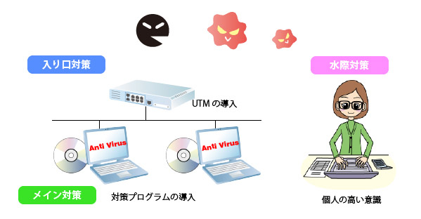 マルウエア対策は、おおまかに「メイン対策・入り口対策・水際対策」の3つのポイントで行います。