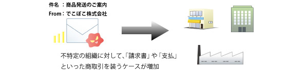 ばらまき型攻撃メールとは、不特定多数に向けた攻撃メールで、もっとも多いパターンです。以前は英語のものがほとんどでしたが、最近は日本語で書かれ、実在する企業からの注文連絡や宅配便の連絡、複合機の自動送信などを装ったばらまき型攻撃メールが急増しています。