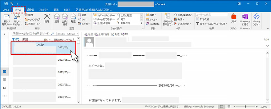 ホームタブを選択した状態で、メールボックスから迷惑メールとして振り分けたいメールをクリックし特定します。