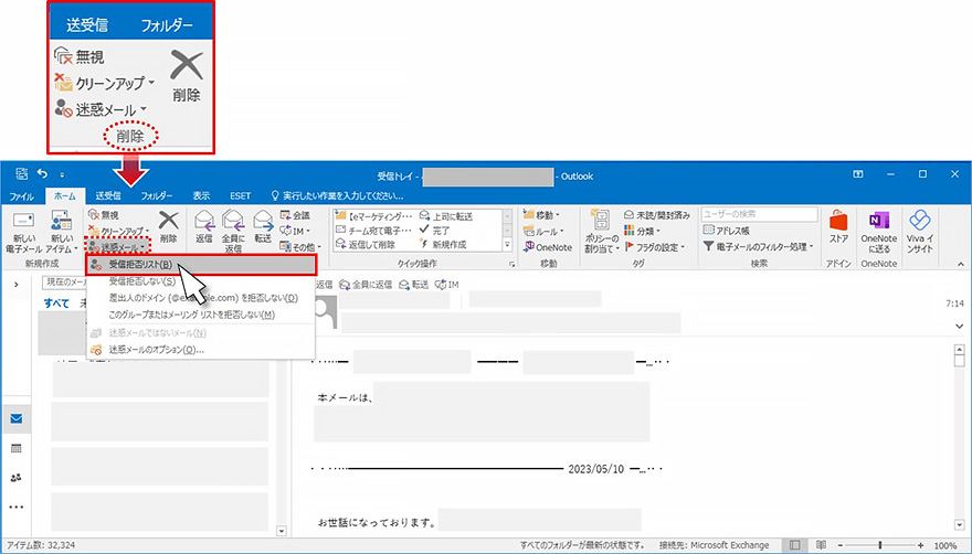 ツールバー「削除」グループから「迷惑メール」をクリックし、表示されたメニューから「受信拒否リスト」をクリックします。