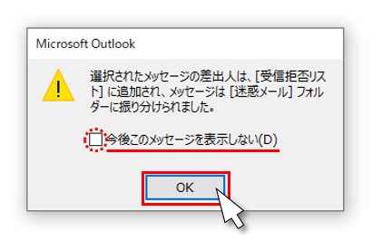 選択したメールが「迷惑メール」フォルダに振り分けられたことを通知するダイヤログボックスが表示されます。