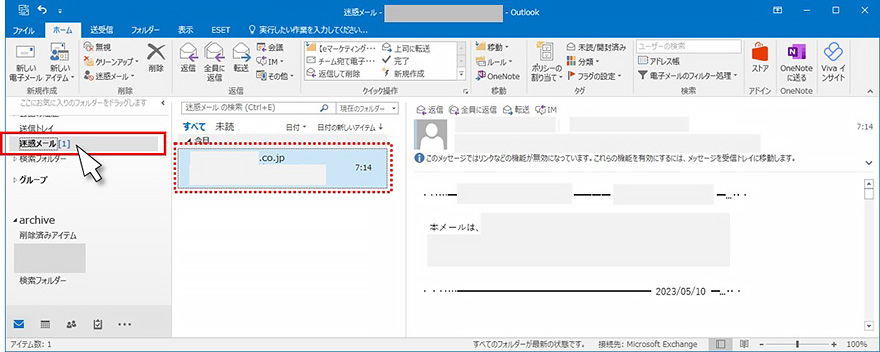 「迷惑メール」フォルダをクリックし、指定したメールが迷惑メールとして振り分けられているかを確認します。