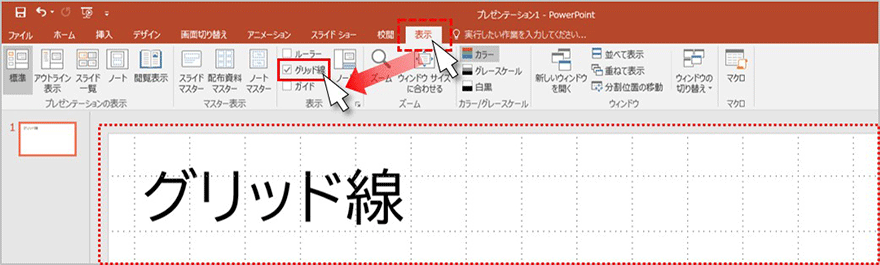 グリッド線を表示するには「表示」タブのグループにある「グリッド線」にチェックを入れます。作業ウィンドウ内に格子状の点線が表示されます。
