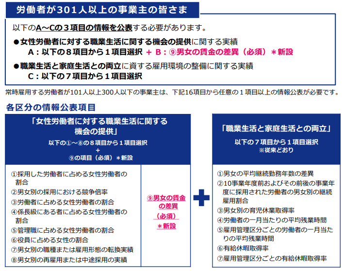 従来、女性活躍推進法では、常時雇用する労働者が301人以上の事業主に「管理職に占める女性労働者の割合」等の厚生労働省令で定める項目のうち、2つ以上を公表することを義務付けていました。