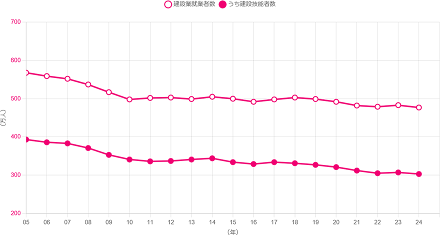 また、建設業の就労条件は、他の産業と比較して賃金が低く、労働時間が長い傾向にあります。そのため、「きつい、汚い、危険」という「3K」のイメージを払拭できず、担い手確保を困難にしています。