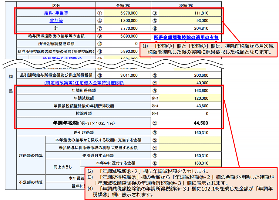 また「源泉徴収税額」欄には、年調所得税額から年調減税額を控除した残額に復興特別所得税(102.1%)を加算した金額を記載します。
