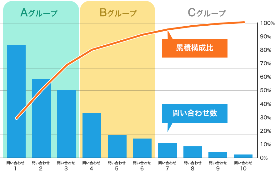 ABC分析でAに該当する項目は優先的にFAQに掲載すべきですし、Bに該当する項目は余裕があれば対応する、Cに該当する項目は対応不要か後回しでよい、と視覚的に判断できます。