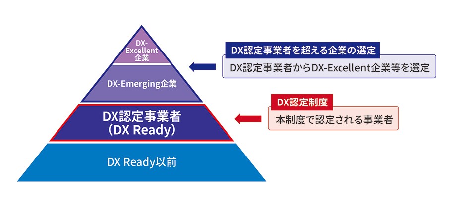 経済産業省とIPAが発表している「DX認定制度 申請要項(申請のガイダンス)」によれば、制度の全体像は4段階に分かれ、DX認定制度はこのうち「DX認定事業者(DX-Ready)」を認定する制度です。