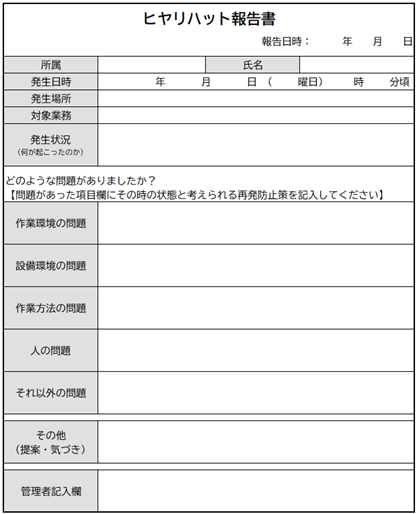 ヒヤリハット報告書は、誰でも同じ品質で書けるフォーマットが重要です。