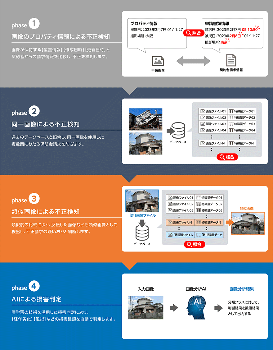 過去のデータベースと照合し、同一画像を使用した複数回にわたる保険金請求を防ぎます。