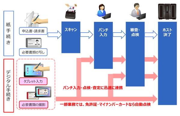 キヤノンMJが今回構築した2つのデジタルソリューションは、既存のシステムと連携することで保険の契約からメンテナンスまでの業務プロセス全体を最適化し、生産性の向上を支援します。