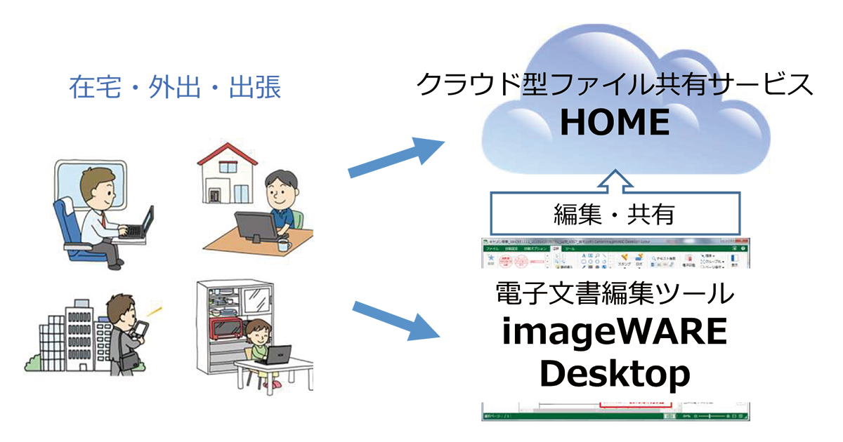 ドキュメントツール「imageWARE Desktop(イメージウェア デスクトップ)」を利用して、クラウドストレージサービス「HOME type-S2」に保存した文書の閲覧・編集・印刷を行うことができます。ファイル名編集などの基本的な操作に加え、PDFファイルにも注釈を付与し紙文書のような備忘録や伝達事項の記載を行うことで、電子化した紙文書を介してテレワークやモバイルワークの利用者との情報共有と利活用を推進します。