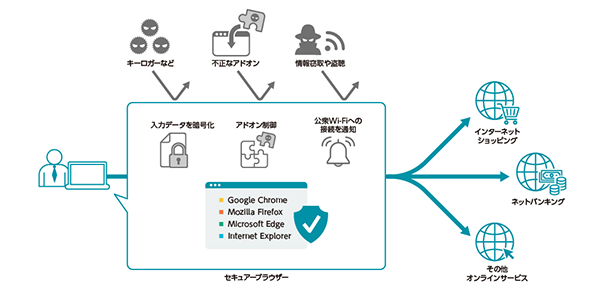 ESET個人向け製品では、従来から金融系Webサイト利用時に有効な「セキュアーブラウザー」を提供しています。セキュアーブラウザーはアドオンを無効化し、入力データを暗号化することで情報窃取を防ぎます。