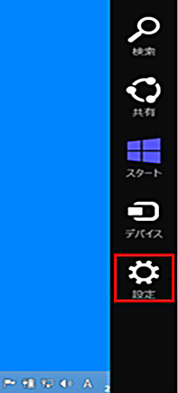 デスクトップ画面を表示し,マウスカーソルを画面の右下隅にあわせてから、マウスを上に移動させ、下記のチャームバーを表示し設定を選択します。