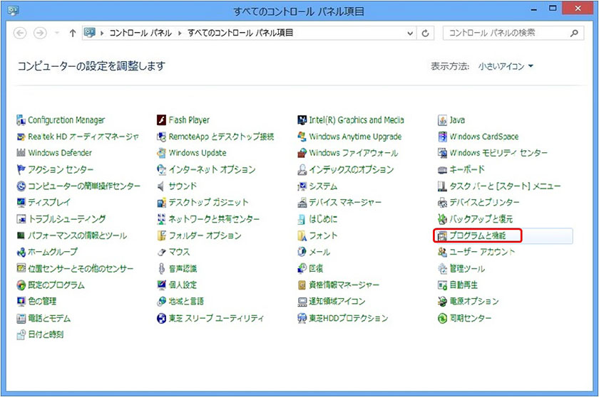 コントロールパネルで「プログラムと機能」(カテゴリー表示時は「プログラムのアンインストール」)を選択します。